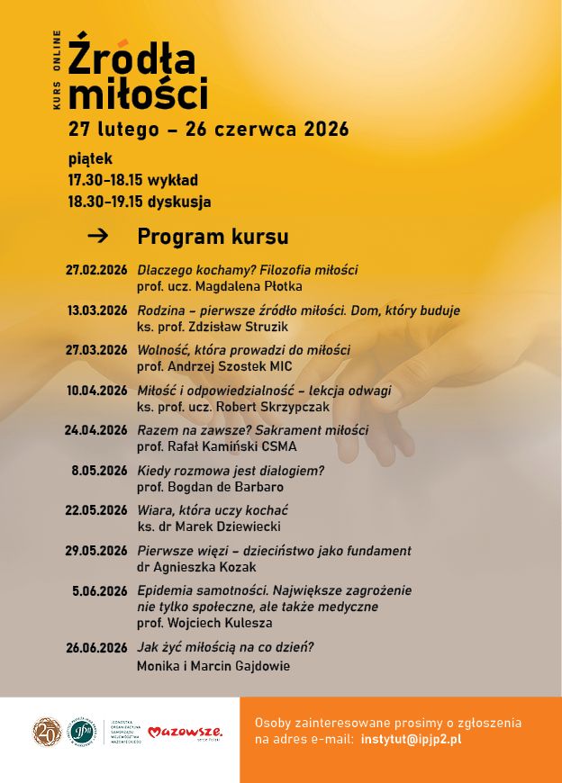 Więcej informacji i zgłoszenia na stronie www: https://programwychowawczy.ipjp2.pl/kurs-zrodla-milosci-2026/?fbclid=IwY2xjawPcPNlleHRuA2FlbQIxMABicmlkETFuYk43c1dIaG1yNDBNSkp4c3J0YwZhcHBfaWQQMjIyMDM5MTc4ODIwMDg5MgABHvNURroXDXz5nbxNLjg38fiKmF_xN8RZFckFrjvvwTJRQmEE_S3Grnq1fmCy_aem_d1Q25BOuYYvrojtsHqQAhw#materialy